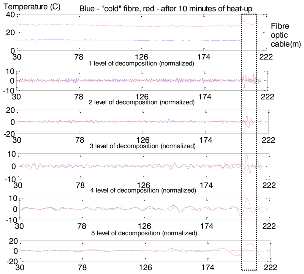 We can represent leakage as two rapid changes in a spatial set of observations: much lower temperatures in the area of leakage [32]. There are different approaches to detect such rapid changes in time series, e.g., Student’s T-test [33]. A detailed overview of more advanced detection methods is presented in [34]. Zhang [35] uses wavelets for abrupt fault detection. Percival [36] applied wavelets to analyse the water temperature measurements from the Wivenhoe Dam. Each signal was decomposed using wavelets into daily, sub-annual and annual (DSA) components. Each of the components was used for further analysis.