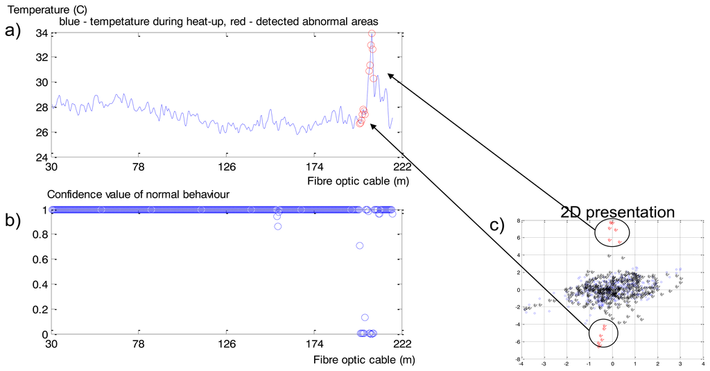 Values in the spatial time series after 10 min of heat-up (Figure 16a) are presented as normal or abnormal points in Figure 16b: values close to 1 correspond to normal behaviour; close to 0 is interpreted as anomalies. Figure 16a is classified in Figure 16c by a 2D view of the constructed Neural Clouds. A cluster with normal data related to the training set is presented in Figure 16c with blue points, the test set is presented with black points and the detected outliers are marked in red.