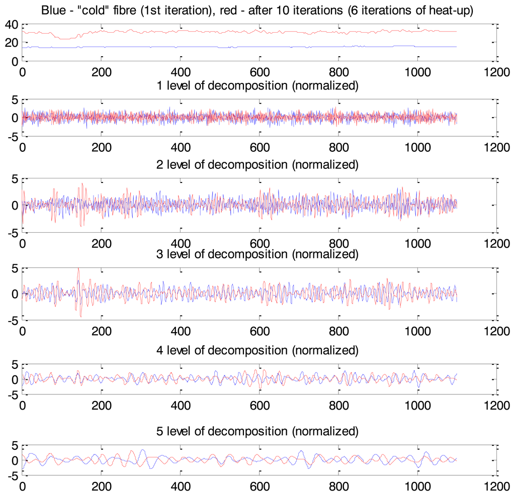 This effect can be interpreted as an anomaly and task of anomaly detection can be formulated as task of non-saturated soil detection. The Maximum Overlap Discrete Wavelet Transform (MODWT) was used for Rhine levee data analysis. Eight levels of decomposition (“la8”: least asymmetric wavelet with 8 levels of decomposition) are presented in Figure 15. As we can see from Figure 15 coefficients corresponding to the third and fourth levels of decomposition show the most protruding features. Therefore we apply them after post-processing as input for the one-side classifier. Measurements related to the cold fibre and several first minutes of heat-up were used for the NC training.