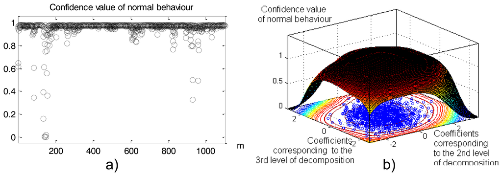 MODWT has been applied for spatio-temporal time series pre-processing (“la8”, eight levels of decomposition). The calculated wavelet coefficients are presented in Figure 18. Coefficients corresponding to the second and third levels of decomposition after post-processing were used as an input for the one-side classifier.