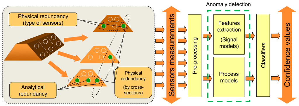 Multidimensional sensor measurements can be grouped according to so-called physical redundancy (see Figure 2), whereby signals from neighbour sensors, sensors from the same cross-section or sensors measuring the same physical parameters can be analyzed by one classifier. Another way of grouping is evaluation of analytical redundancy between the sensors—sensors are grouped if a clear and stable relation between sensor values is detected. In this way the consistency of detected dependencies is monitored.