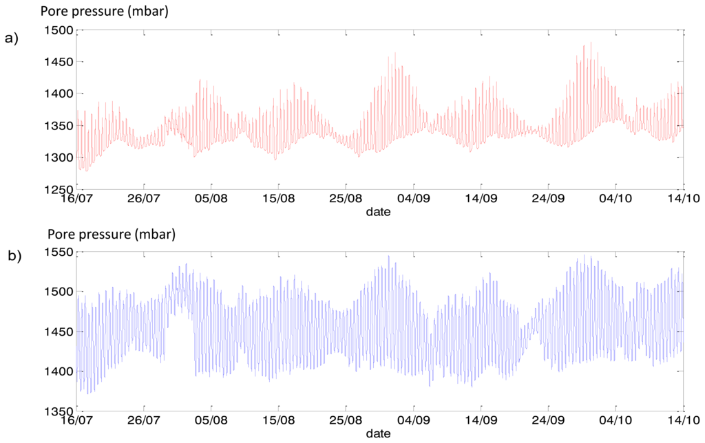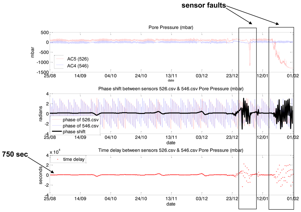 In case of levee health monitoring, tidal changes in water levels propagate through the soil inside the dike and cause periodic rises of water pressure at the sensors (see Figure 6). Since soil that fills the levee is a porous material with a relatively low permeability, water flow experiences resistance and reaches the sensors with some delay: the further from the sea the longer the time delay (called “phase shift” in signal analysis).