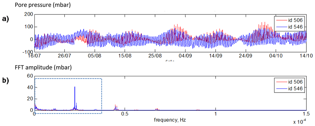 The phase shift and time delay between both signals were analyzed for the same base frequency (12 h) extracted from the FFT spectra. In Figure 24b one can see the phases of #506 (blue line), #546 (red line) and difference between two phases (black line) calculated with a sliding window (1,024 timestamps, shift for 32 timestamps). Presentation of the time delay can be found in Figure 24c. It can be concluded that the time delay between sensors is stable (approximately 1 h and 40 min). For high/low tide cycles with frequency of 12 h the #546 sensor shows similar behaviour in comparison to #506 sensor with a delay of 1 h and 40 min. Preliminary results show that stability of phase shift between sensors can be used for the whole dike stability evaluation.