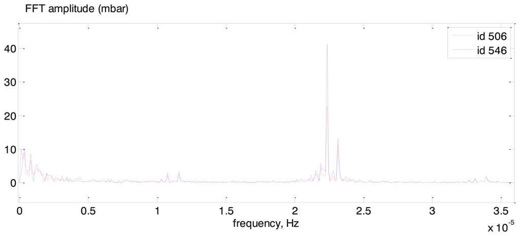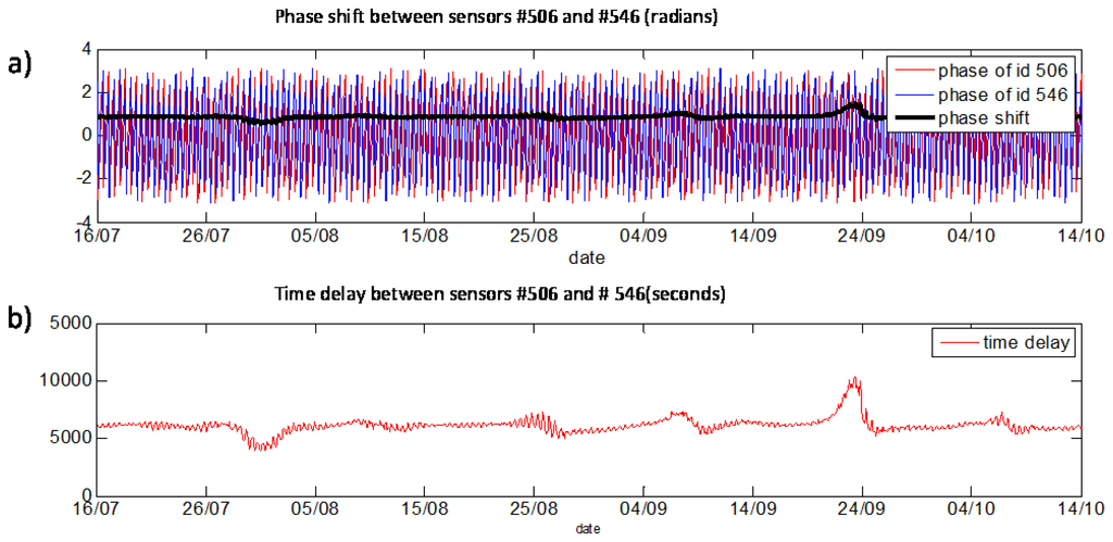 We analysed all sensors, two (#506 and #546—see Figure 20a) were selected for presentation of phase delay analysis. Measurements of these sensors are presented in Figure 21.