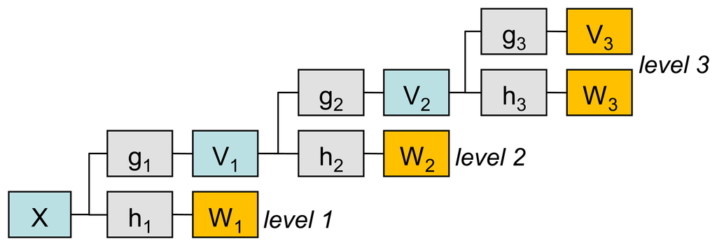 We choose the Maximum Overlap Discrete Wavelet Transform (MODWT) [37] for feature selection. MODWT is a computationally efficient method for time-frequency representation of time series. The MODWT transform is similar to the discrete wavelet transform (DWT), but it does not produce a downsampling of wavelet coefficients [37], which allows it to overcome the lack of translation-invariance present in DWT and does not require the length of the signal to be a power of two. In contrast to CWT, MODWT calculates coefficients at scales 2j (where j is a level of transform) without the loss of information. This property provides faster computation of MODWT coefficients than CWT computation. The procedure of MODWT coefficient calculation can be described as an application of linear filters (wavelet and scaling filters) via a cascade algorithm (see Figure 3).