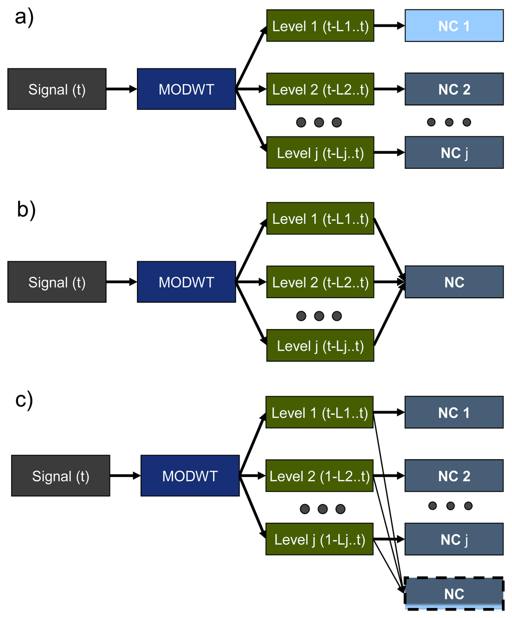 MODWT and a one-side classifier (the Neural Clouds (NC) method is described later in this Section) can be combined in different ways (see Figure 5): each level of decomposition can be checked by individual NC (Figure 5a); or all levels can be grouped for analysis by only one NC (Figure 5b); or a combination of both (Figure 5c). We used the second approach in our work.