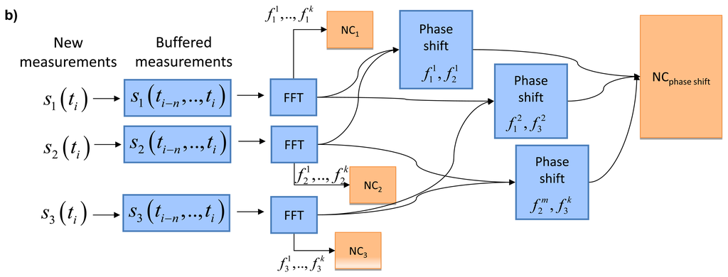 A pairwise phase shift analysis can be extended to the analysis for sensor triplets (Figure 6a). Phase delay within the triangle should not change in time. Application of each individual sensor in phase shift analysis of several pairs guarantees redundancy. This means that detection as well as localization of the anomaly is possible. A phase delay is calculated from the time-frequency components related to two sensors, therefore we classify this feature as a ‘spatial time-frequency feature’.