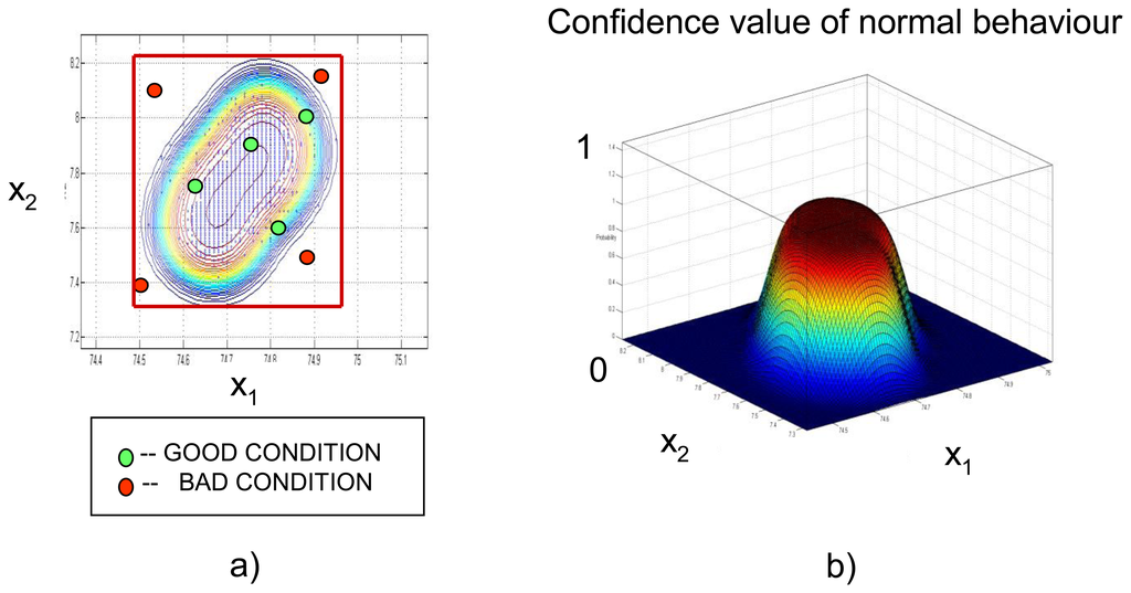 The NC encapsulates in a hypersurface all previously known configurations of selected parameters for a given training period (Figure 8a). It provides a more accurate classification of multidimensional data in normal and abnormal conditions in comparison to a simple hypercube approach. Red points in Figure 8a are incorrectly classified by the hypercube approach as ‘normal’ mode and are correctly classified by NC to reflect ‘abnormal’ mode. After training, the NC calculates a confidence value for every new state of the dike. Figure 8b shows a 3D presentation of the NC: X-Y plane that contains 2D data shown in a, the Z-axis interprets behaviour of the monitored object: values close to 1 are related to normal behaviour, values close to 0 can be interpreted as anomalies.