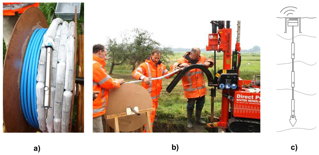 In 2008 Alert Solutions introduced its sensor network GeoBeads for levee and slope stability monitoring. GeoBeads was developed to provide all essential dynamic parameters for the determination of soil stability (Figure 9a). GeoBeads consist of fully digital sensor modules (nodes) based on robust semiconductor technology that can scale to a wide area network of measurement locations. Each small sized node in the network can simultaneously house various measurement devices. The set per node commonly includes a piezometer, an inclinometer and thermal sensors [43,44]. Local contractors execute the installation with regular drilling or push-rig equipment (Figure 9b). Data is immediately available and is distributed via the internet.
