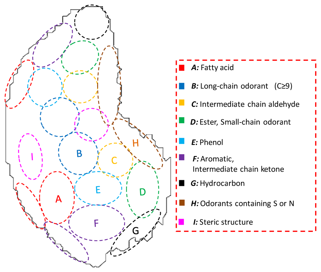 To apply odor clustering to sensor technology, previous research examined the extraction of the clustering and geometric features of odor maps by analyzing odor map images developed in other laboratories [20]. The defined odor clustering maps and the common characteristics of odorants belonging to each cluster were described in Figure 1. For instance, fatty acids have carboxylic groups, hence, they belong to the cluster A. The biological olfactory enables comprehensive detection and appropriate classification of odors by the discrimination of structural features of odorants described in Figure 1 and optimally classify odorants into clusters based on the ORs signals. Therefore, olfaction-inspired sensing is possible by sensor devices with critical molecular recognition ability that can construct odor-clustering maps of biological olfaction.