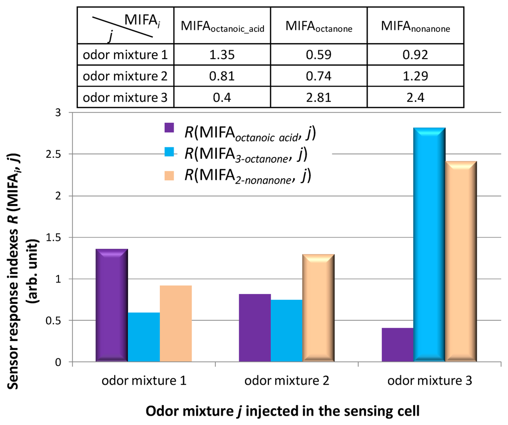 The MIFAs-embedded sensor system could simultaneously detect multiple odors. We tested three types of odor mixtures using the odor-separating system. The measured odor mixtures are shown in Table 2. The pasted adsorbents include MIFA0, MIFAoctanoic acid, MIFA3-octanone, and MIFA2-nonanone. Figure 10 shows the sensor response index R(MIFAi, j) to odor mixture j trapped by MIFAs, relative to MIFA0. The responses of MIFAoctanoic acid and MIFA2-nonanone were maximum to the odor mixtures 1 and 2 containing octanoic acid and 2-nonanone, respectively. However, the adsorption amounts of MIFA3-octanone and MIFA2-nonanone were higher than one of MIFAoctanoic acid, for the odor mixture 3 including 3-octanone and 2-nonanone. Therefore, it was suggested that the system could successfully detect template odorants selectively, and the digitization of various odor patterns was accomplished by the adsorption properties of MIFAs.