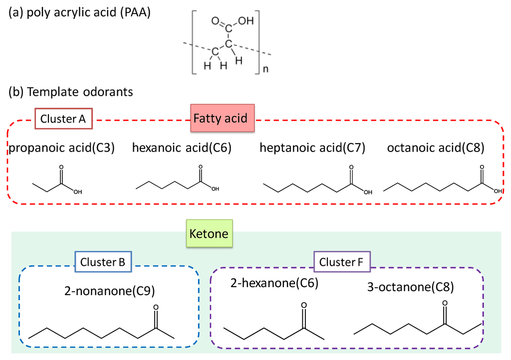 Polyacrylic acid (PAA), titanium (IV)-n-butoxide (Ti(O-n-Bu)4), and template odorants (propanoic acid, 2-hexanone, 2-heptanone, and 2-nonanone) were purchased from Wako, Osaka, Japan. Other templates (hexanoic acid, octanoic acid, and 3-octanone) were purchased from Kanto Chem., Tokyo, Japan. PDMS layers were fabricated using SILPOT 184 W/C of Dow Corning Toray Co., Ltd., Tokyo, Japan. All these chemicals were guaranteed reagents and were used without further purification. Molecular structures of the odorants used in this study and their clustering attributes are shown in Figure 2.