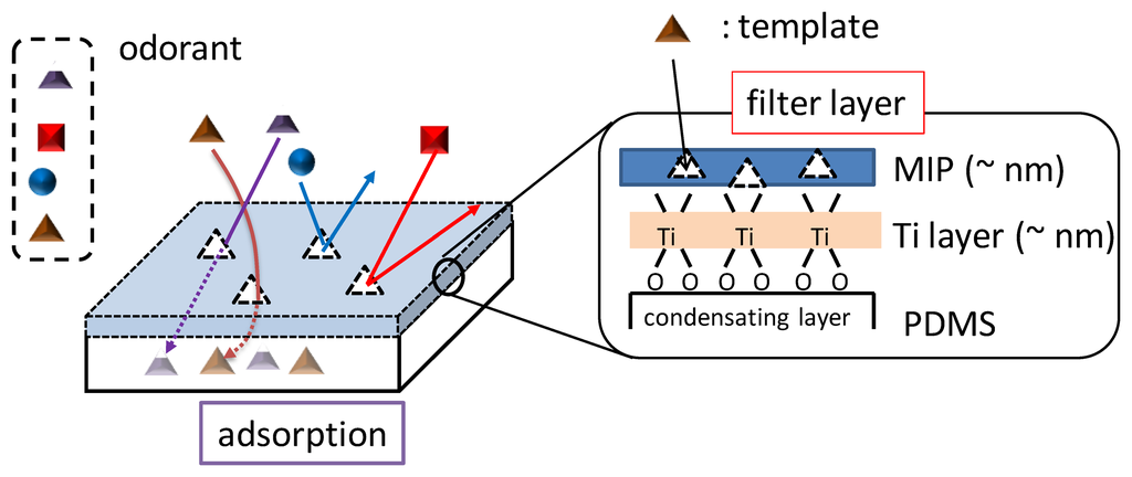 The molecular recognition abilities of conventional adsorbents are insufficient to discriminate the complex shapes or functional groups of odorants. That is, these materials have no appropriate selectivity for odor clustering. Therefore, nanothick filters with high molecular recognition were deposited on the adsorbents using the surface sol-gel process and molecular-imprinting technique (MIT) [24–30]. Molecularly imprinted filtering adsorbents (MIFAs) were developed in these studies [31]. MIFAs were composed of the molecularly imprinted polymer (MIP) filter and a polydimethylsiloxane (PDMS) substrate. PDMSs can work as a concentrating layer to increase the quantity of odorants.