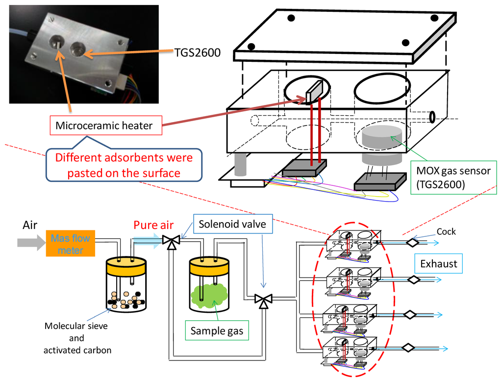 Odor measurements were carried out using the odor-separating system, shown in Figure 4. Four sensing cells are embedded in this system. Each cell has a microceramic heater (MS–M5, Sakaguchi E.H VOC Corp., Tokyo, Japan) in the front of a MOX gas sensor (TGS2600, Figaro Engineering Inc., Osaka, Japan). The sensing element of TGS2600 is comprised of an n-type SnO2 layer on an alumina substrate of a sensing chip together with an integrated heater. TGS2600s have cross-sensitivity to various chemicals, although they could not identify chemicals because of the low selectivity. The odor-separating system improved the selectivity by MIFAs.