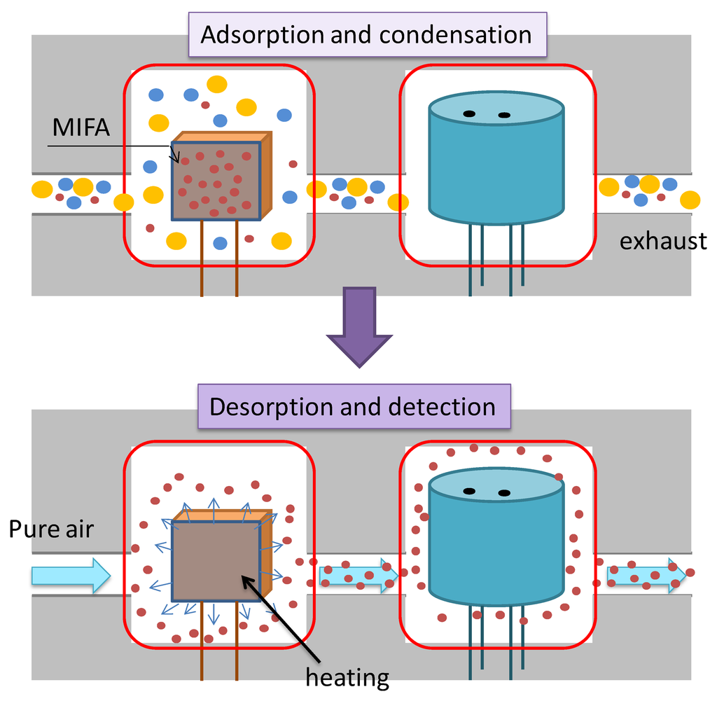 An aliquot of 10 μL template bulk solution was absorbed by a cotton paper which was sealed in the gas-washing bottles. Sample vapors were attenuated with certain concentration by pure air. The concentration of sample vapors was measured as in our previous research [22]. For instance, the concentration of propanoic acid was 113 ppb. In addition, the concentration of 3-octanone injected into the system was approximately 1 ppm which were confirmed using a photoionization detector (Firstcheck+, Ion Science Ltd., Cambridge, England). It was thought that the concentration of all mixtures and odorants used in this study reached approx. 1 ppm roughly. Vapor flows were switched on for 1 min, and then switched off to flesh air flow to recover the sensor response. For desorption of the adsorbed vapors, the microceramic heater was heated to 100 °C for 200 s. Then, the linked MOX gas sensors detected and measured vapors desorbed from the adsorbents. The schematic graph of vapor concentration and separation mechanism of an odor-separating system is shown in Figure 5.