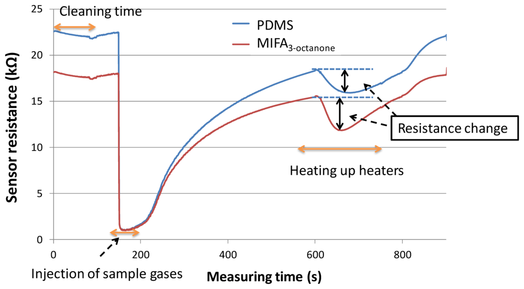 Untreated PDMS and various kinds of MIFAs were pasted on the surface of four heaters, respectively. This system could guarantee the concentration of measured vapors into adsorbents because of the small volume of flow path (1.7 cm3) and low flow rate (0.15 L/min) in each sensing cell. In our previous study, the sensing system could detect and discriminate odorants in the ppb level [22]. The high sensitivity of PDMS as the concentrating materials for target VOCs was confirmed using the odor-separating system. Then, the measurement of concentration dependence of some chemicals and class identification of target VOCs were achieved [38].
