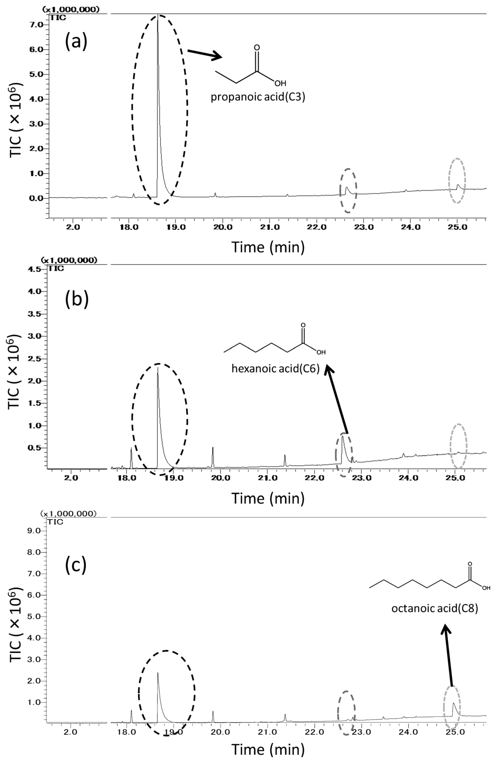 Figure 7 shows three chromatograms related to the samplings of the odorant mixture, which is consisted of propanoic, hexanoic, and octanoic acids, trapped into: (a) untreated PDMS, (b) MIFAhexanoic acid, and (c) MIFAoctanoic acid. Here, we choose MIFAi to represent the MIFA with a binding site for odorant i. In Figure 7, the adsorption peak of propanoic acid from MIFAs decreased compared with that from untreated PDMS. It was shown that hexanoic acid was more adsorbed on MIFAhexanoic acid and less adsorbed on MIFAoctanoic acid, whereas the octanoic acid peak of MIFAoctanoic acid was large and that of MIFAhexanoic acid was small.