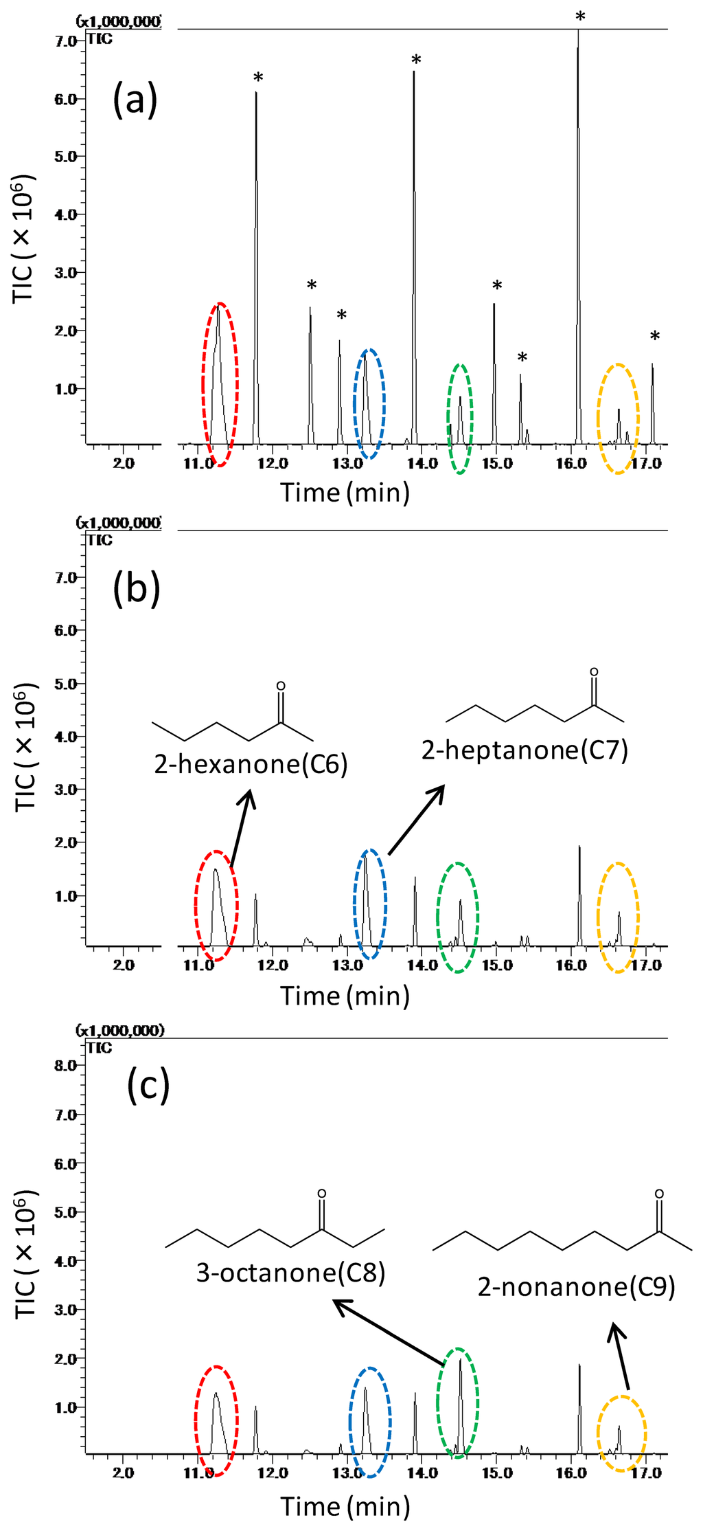Figure 8 shows three chromatograms based on the adsorbing amounts of the mixed odor which is consisted of four types of ketones: 2-hexanone, 2-heptanone, 3-octanone, 2-nonanone, trapped on: (a) untreated PDMS, (b) MIFA2-heptanone, and (c) MIFA3-octanone. In Figure 8a, some remaining siloxane derivative peaks are shown. These peaks are attributed to the SPME fiber coating, GC-column, and the untreated PDMS as shown in Figure 8a. The eight peaks * starting from the left in the Figure 8a represent bis[(trimethylsilyl)oxy]trisiloxane, dodecamethylhexasiloxane, dodecamethylpentasiloxane, dodecamethylcyclohexasiloxane, hexadecamethyloctasiloxane, tetradecamethylhexasiloxane, tris-(trimethylsiloxy)tetrasiloxane and tetradecamethylheptasiloxane. The results show that these detected substances have little influence on the adsorption of odors. As shown in Figure 8, the MIFAs peaks of non-template odorants decreased, and the peaks of the template of each MIFA did not decrease, compared by that of untreated PDMS.