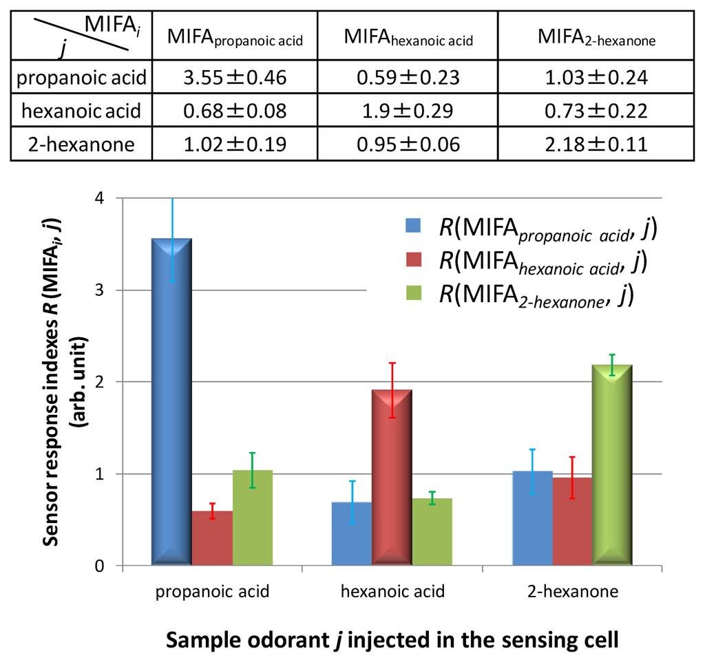 Consequently, it is believed that MIFAs represent the specific adsorption ability to the template odor in the presence of various types of chemicals. MIP filters with a high molecular sieve effect could be deposited on PDMS, and MIFAs adsorbed only the odorants that passed through the imprinted template site. However, MIFAketone shows less filtration than MIFAfatty acid, which may be attributed to the affinity to MIP filter of ketones or the high concentration than carboxylic groups.