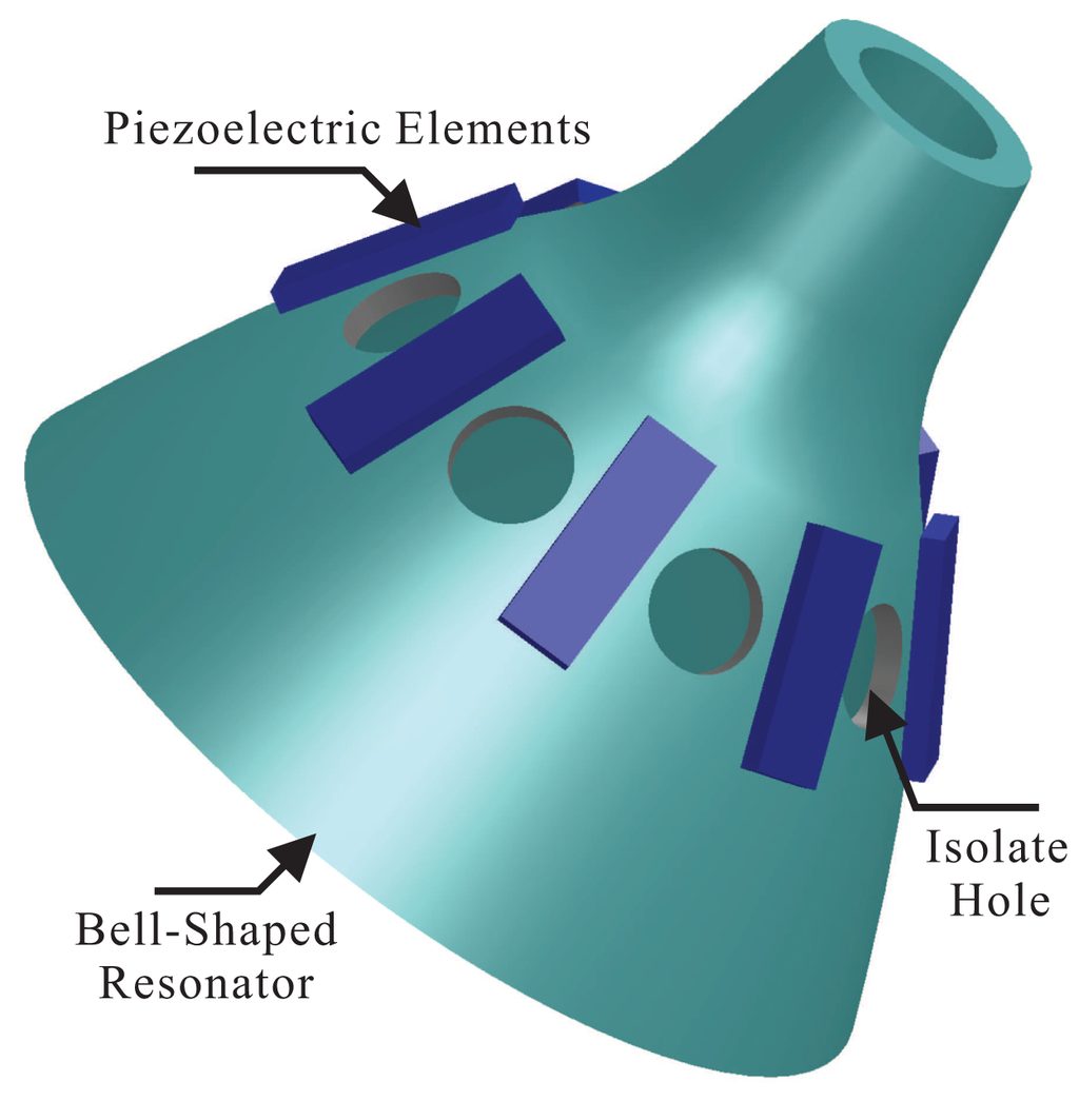 Bell-shaped vibratory angular rate gyros, using a piezoelectric ceramic electrode (PZT5A) stuck to the resonator's wall, drive the resonator to generate four antinodes vibration and generate stabilized standing waves. It measures the input angular rate by detecting the resonator's standing wave precession under the spinning condition [6]. The structure of the bell-shaped resonator is shown in Figure 1, including the bell-shaped resonator, piezoelectric elements and the isolate hole.