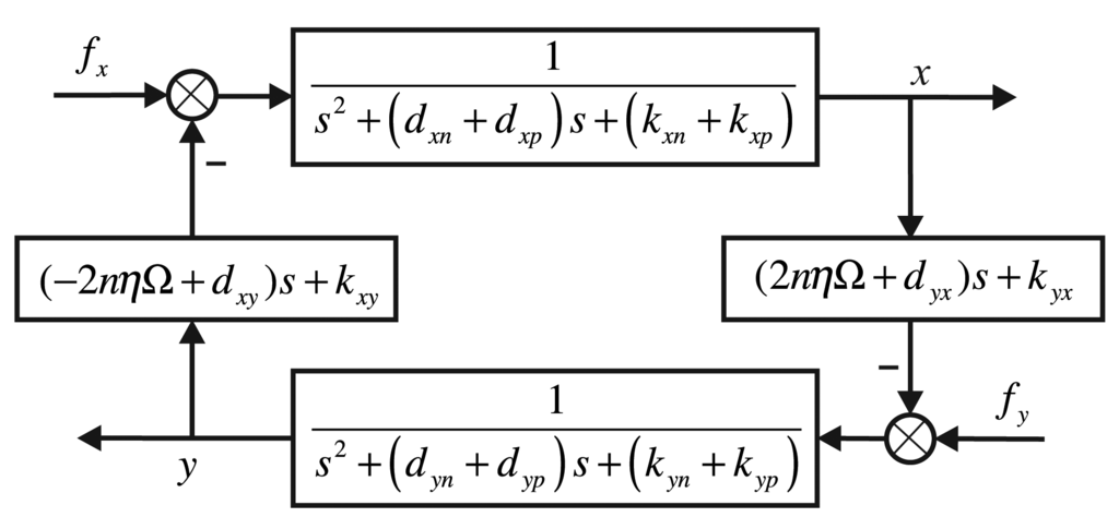 The quadrature control loop and rate control loop are mainly designed for the y-axis. The aim is to make the bell-shaped resonator's mode shape have no procession, that is to make the output in the y-axis be zero. The quadrature control is to make the x-axis and the y-axis have the same phase. The rate control is to make the output's amplitude on the y-axis be zero. The motion on the y-axis can also be thought of as a standard two-order system with disturbance; the disturbance signal is an output in the x-axis and the input angular rate from the outside. The dynamic function is: