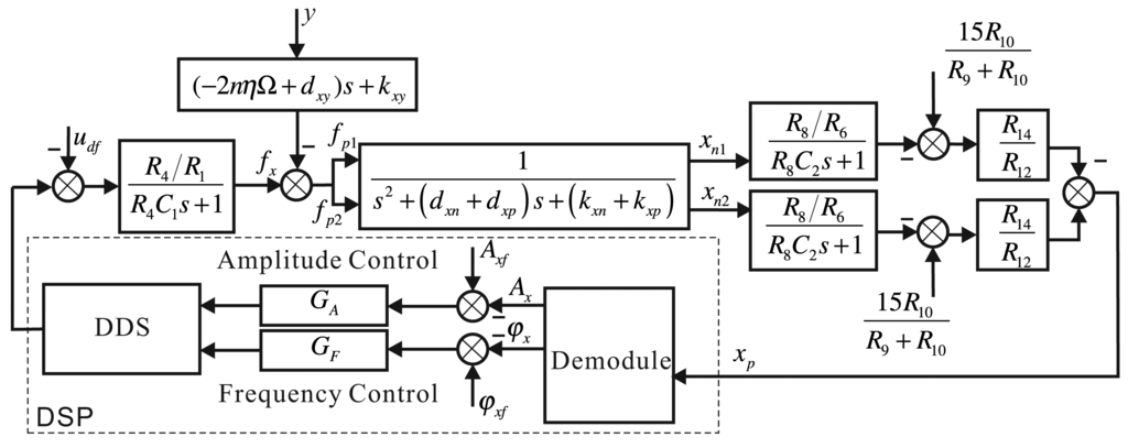 Adding the driving components and detecting components, the whole control loop of the x-axis is shown in Figure 13. The output is the DDS digital signal that DSP produces; the input is the digital signal the ADC collected, and we use DSP to make the controller. The digital signal DSP output goes through the driving components, drives the x-axis's driving electrodes with two parts, detects the x-axis's two detecting electrodes with the detecting components and performs the difference process. The controller detects the vibratory signals in the xp-axis, calculates the amplitude and phase of the signal, calculates the control error with the given amplitude and phase, designs the amplitude controller and frequency controller and real-time adjusts DDS's output. In Figure 13, the driving components and detecting components use resistors of the same value for different electrodes in order to describe them conveniently, and there is no detailed information.
