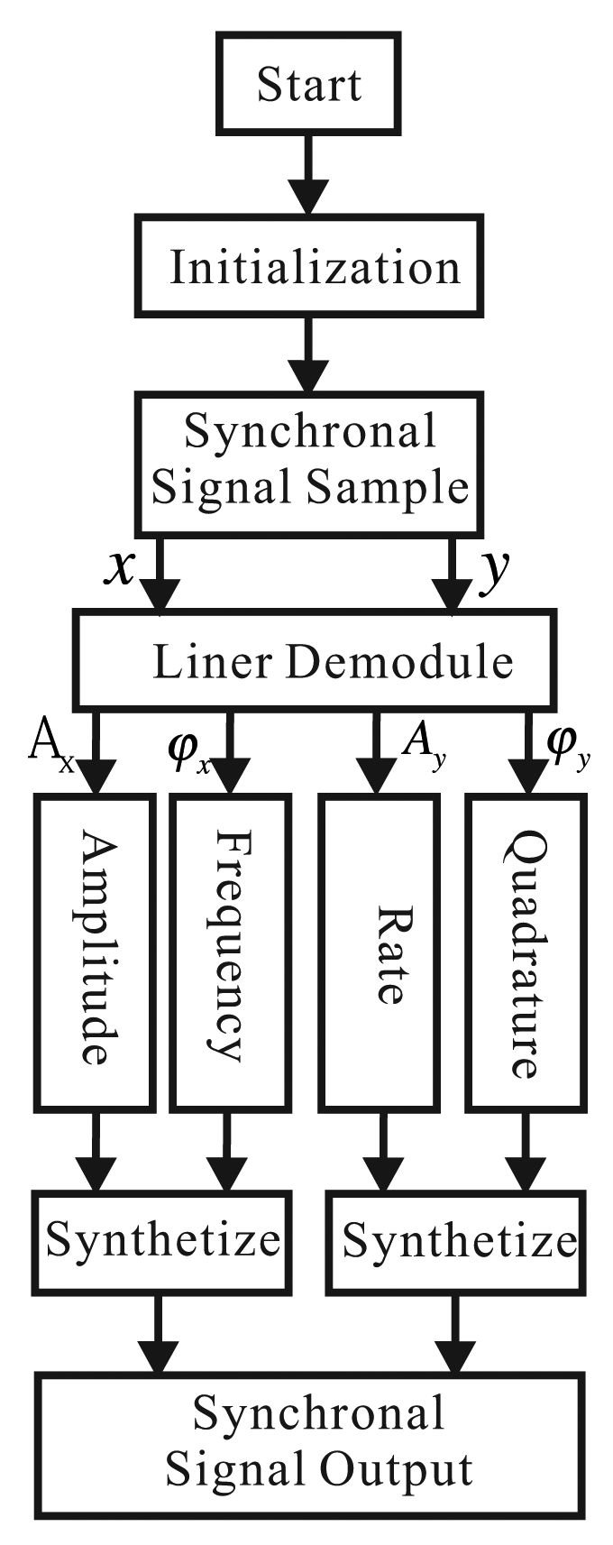 For the output signals of the detecting electrodes and feedback electrodes, we need to calculate the amplitude and phase. In the circuit system of the bell-shaped vibratory angular rate gyro, we use linear demodulation for the calculation [19]. The detailed process is, assuming the output signal on the x-axis: S = Ax sin (ωxt + φd), where φd is the whole phase. Using the signal generated by DDS as the demodulation signal, we multiply and filter the output signals to get the in-phase component, xd, and quadrature component, yd. The detailed process is: