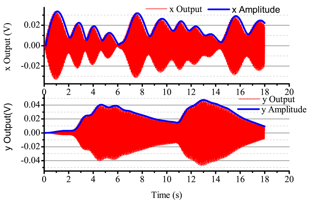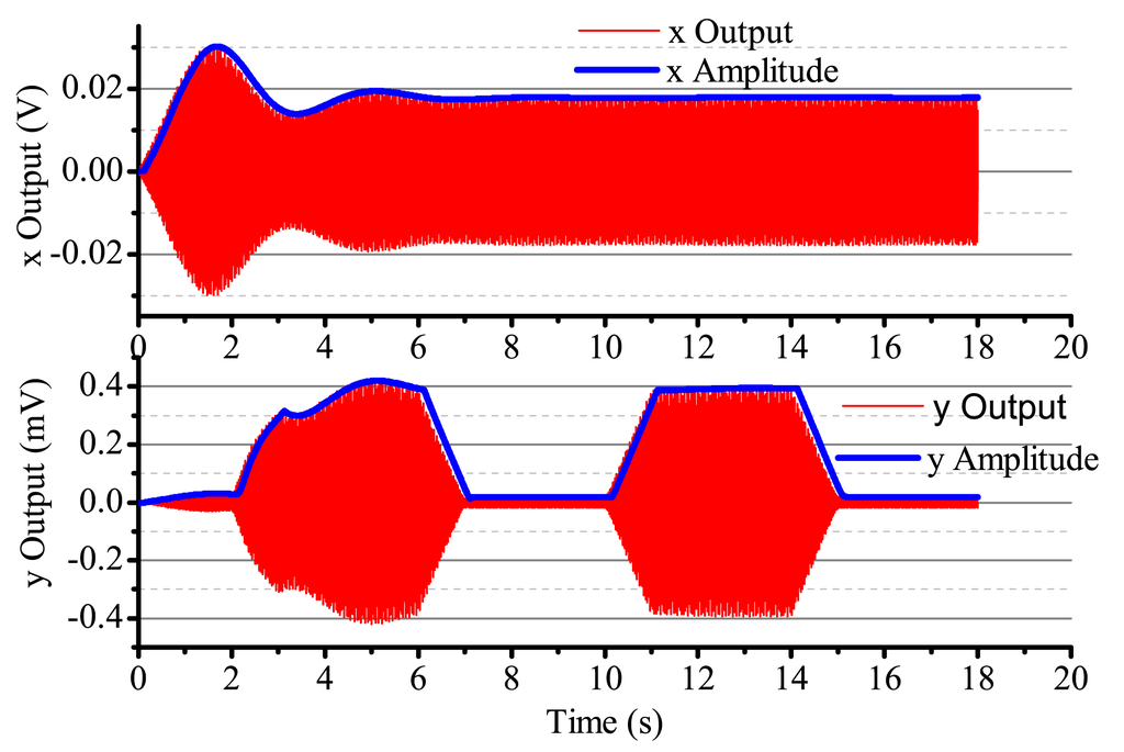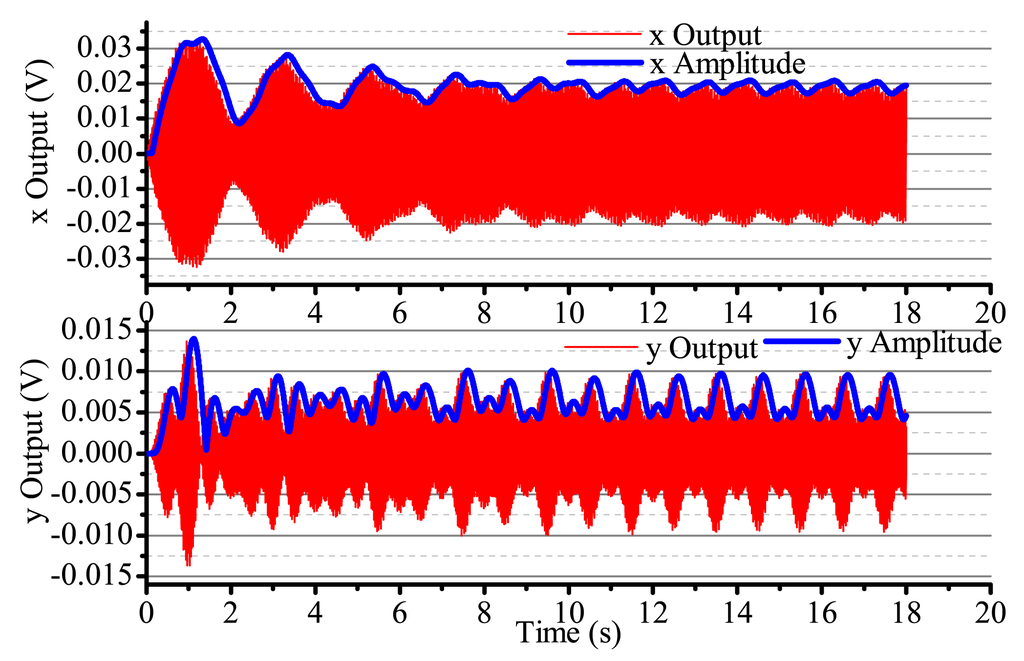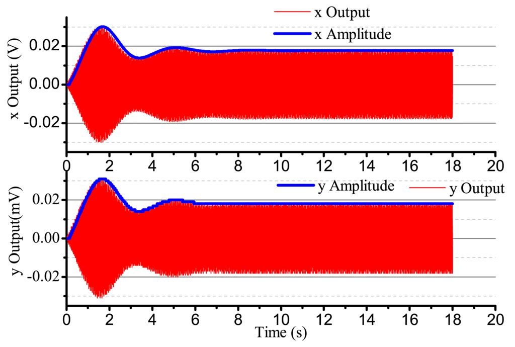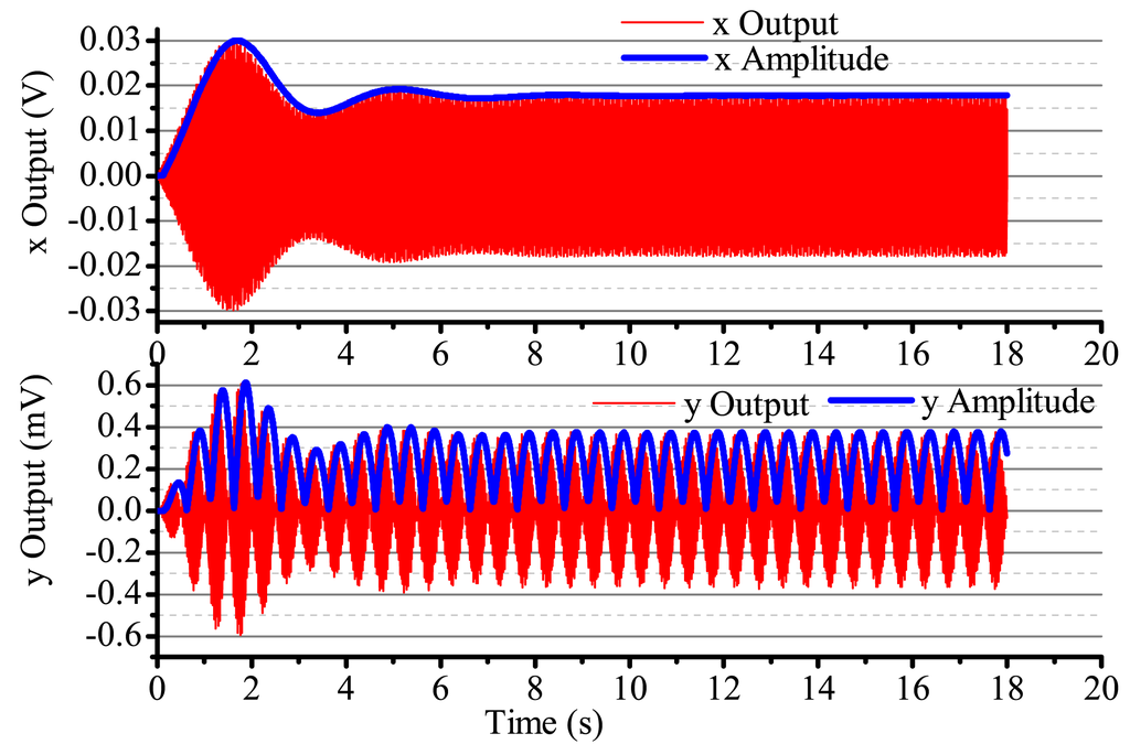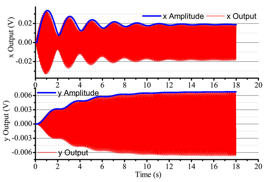 When the input angular rate is zero, that is Ω = 0 (no control loops), there is only driving in the x-axis. The output result is shown in Figure 16. After adding four control loops, the actual output is shown in Figure 17. From Figure 16, we notice that the resonator is under the non-control condition. The output amplitude in the x-axis and the y-axis are all vibratory, and the convergence is slow. The output in the y-axis is influenced by the output in the x-axis and has a certain degree of coupling. The output amplitude in the y-axis is 6 mV. In Figure 17, for adding control loops, the output in the x-axis can stabilize after 8 s, and the output amplitude in the y-axis 0.02 mV, near 0 V. In practice, 0.02 mV is too small of a signal to recognize, so it can be thought of as 0 V. The output amplitude in the y-axis is not the standard 0 V and relate to the precision and the restraining method used.