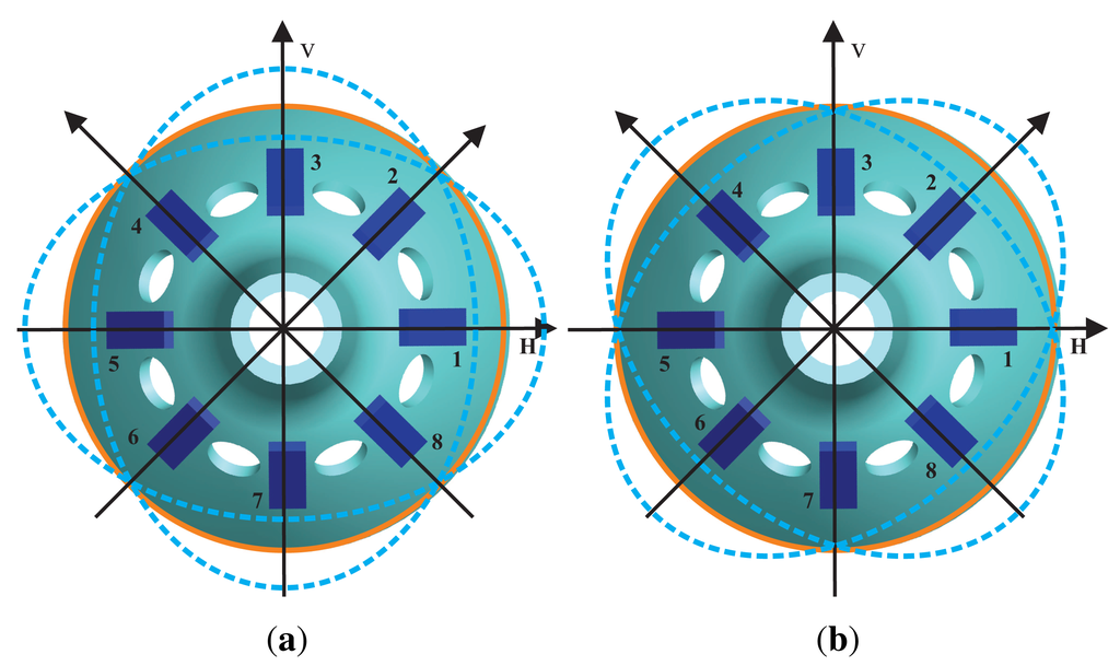 The work mode is four antinodes. It has two inherent stiff shaftings that can be orthogonal decomposed along 45°. Therefore, the axisymmetric shell resonator gyroscopes use a loop distribution of eight electrodes to make the electrodes be on every rigid axis. The traditional cylinder vibratory gyro, which drives electrodes and detects electrodes, uses piezoelectric ceramic material that is stuck to the cylinder's walls to collect signals using amplitude control, frequency control, orthogonal control and rate control to calculate the signals [7–9]. Based on that, Watson improved the precision of the gyroscope by adding two cracking inhibiting electrodes to control the piezoelectric axis effectively [9]. Innalab uses a two-grade column structure to improve the quality of standing waves, changes the position of the electrodes stuck to the cylinder's walls to the bottom and gets the input angular rate by four control loops. Right now, the cylinder vibratory gyros that the company has designed have been wildly used in the aerospace, robot control and vehicle navigation fields. Compared with the cylinder vibratory shell gyros, hemispheric resonant gyros have higher precision, because they use the method of non-contact driving detection and silica material as the harmonic oscillator [10,11]. However, it uses the same calculating method of four-loop control to finish the signal calculation [11]. For the complex process and high price, it has not been widely used in low-cost fields at this time.