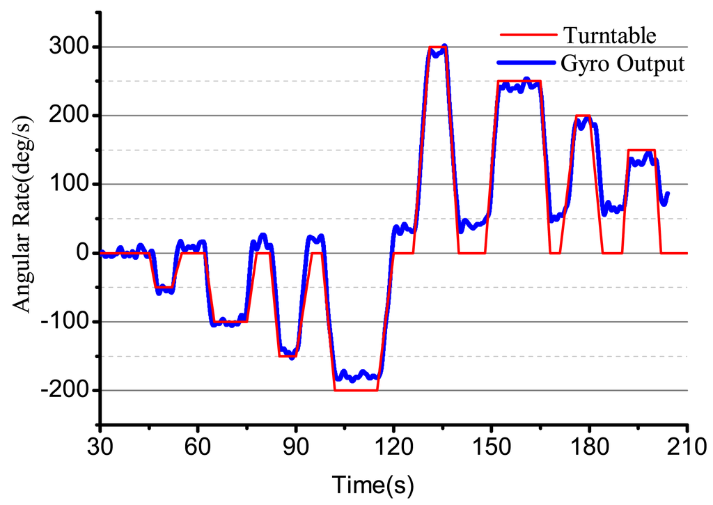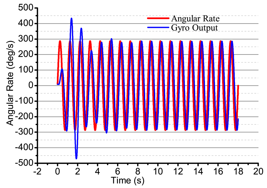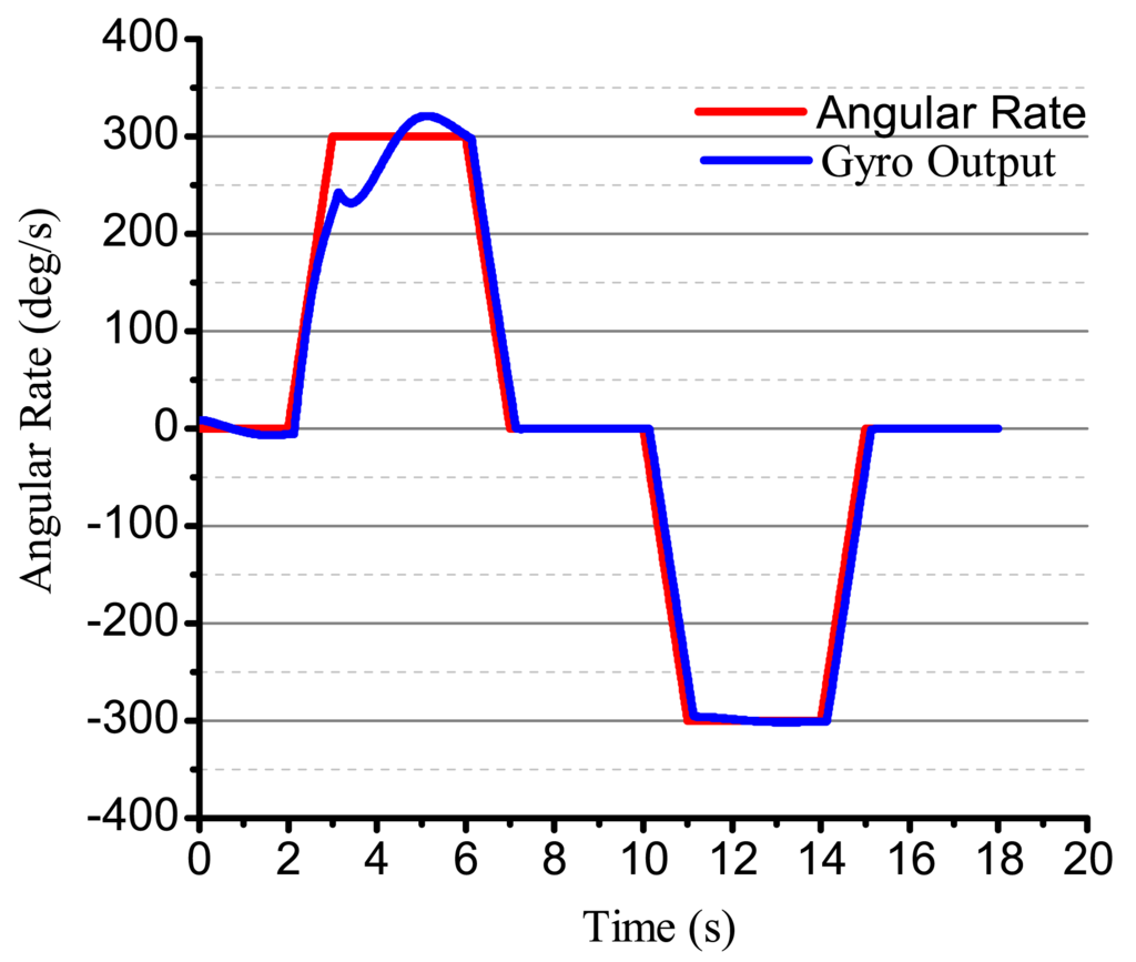 Using the designed electrical system to test the bell-shaped vibratory angular rate gyro, the output angular rate results are shown in Figure 26. We can see that the gyro is close-loop controlled and can get the input angular rate effectively. However, the electrical system, the linearity, random walk, scale factor stability and zero stability are all in need of being improved. The paper mainly studies the design and analysis process and will give the detailed performance in papers to follow.