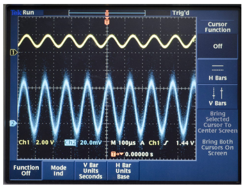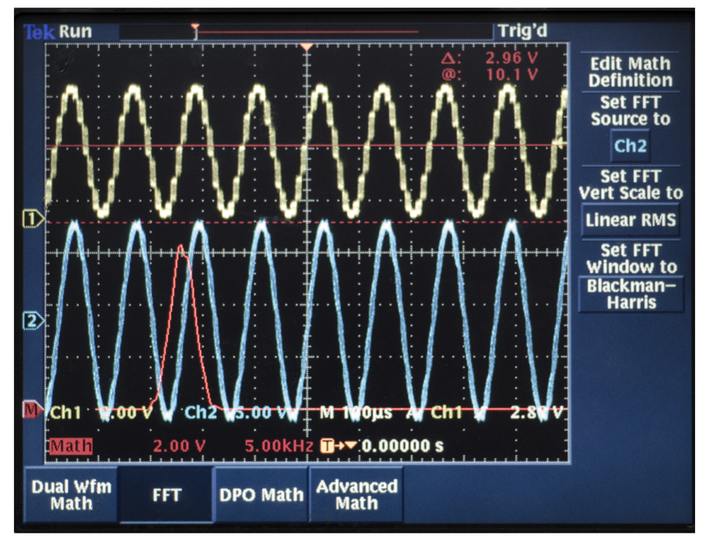 We test the driving components with a Tektronix TDS3032B oscillograph. The signal process circuit uses the DAC to output the DDS's original signal with high frequency noise, which is the yellow curve in Channel 1 in Figure 24. After the driving components, the output is the FFT, which is the red curve in Channel 2 in Figure 24. We can find that the high order harmonic wave has been removed, and the voltage meets the designed requirement.