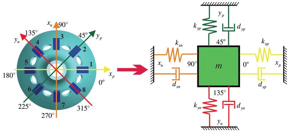 The xp axis that piezoelectric Electrodes 1 and 5 are on and the xn axis that Electrodes 3 and 7 are on form the x shafting. The yp axis that piezoelectric Electrodes 2 and 6 are on and the yn axis that Electrodes 4 and 8 are on form the y shafting. The bell-shaped resonator's standing wave vibration can be orthogonal decomposed along the x shafting and the y shafting. In the two-dimensional spring particle motion model, there is a constraint force, k, and damping force, d, on every axis. The x shafting is the oscillator. The Electrodes 1 and 5 supply the driving signals, and the Electrodes 3 and 7 detect the vibration on the x shafting. The y shafting is responsible for detecting the mode shape's deviation and for controlling the mode shape. The Electrodes 4 and 8 are on the wave node to detect the mode shape's deviating signals. The Electrodes 2 and 6 apply the damping moment to make the shape mode shift to the opposite direction. In Figure 3, dxn, dxp, dyn, dyp are the damping coefficients on the axis and kxn, kxp, kyn, kyp are the spring constants.
