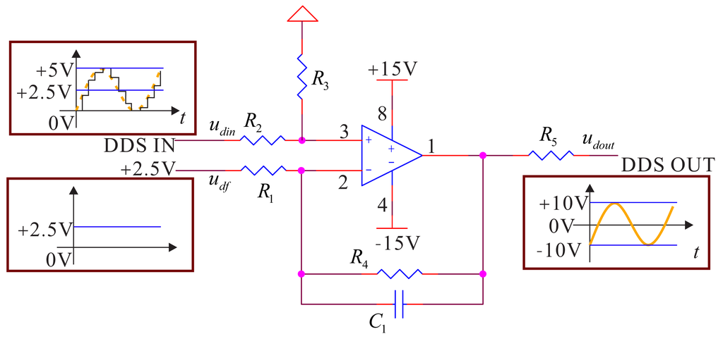 According to the signal and characteristics in Figure 6, the gain is four, and the value of the arguments is: R4 = R3 = 40 kΩ, R2 = R1 = 10 kΩ, C1 = 0.2 μf. Additionally, the frequency is as shown below. For the output resistance, R5 is used to match the driving electrode and the damping electrode, and the value is 1 kΩ. The input DDS's null voltage is udf = 2.5 V. We use the AD8676 PSPICE model produced by ADI company (Dallas, TX, USA) to do PSPICE simulation; the real cutoff frequency is 20.33 kHz, and the cutoff phase is −34.64°. The simulation result is shown in Figure 8.