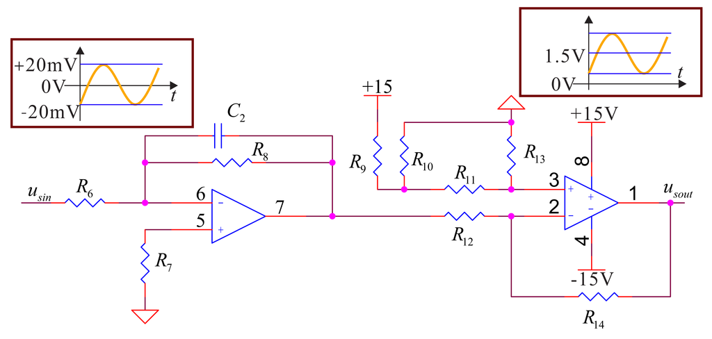 In the detecting components, firstly, the signal should pass a filter amplifying process to remove the high frequency vibratory noise, and then, it should be adjusted to meet the requirement for the ADC to sample. To meet the requirement of signal conditioning, we choose ; the relation between inputs and outputs for a circuit in low-pass filter's pass-band is: