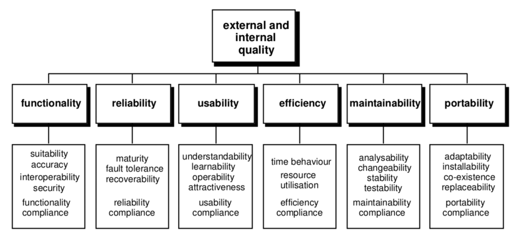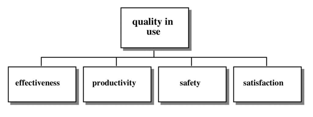 Figure 1. Quality model for external and internal quality [7].Quality in use (see Figure 2): It is the capability of the software product to enable specified users to achieve specified goals with effectiveness, productivity, safety and satisfaction in specified contexts of use.