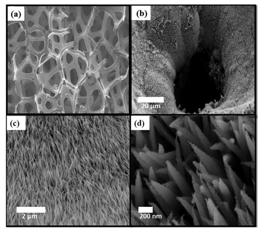 The structural study was performed before and after the growth of NiCo2O4 nanostructures for better analysis of the grown nanomaterial. Figure 1a is the SEM image of bare Ni foam substrate measured at 100 μm.