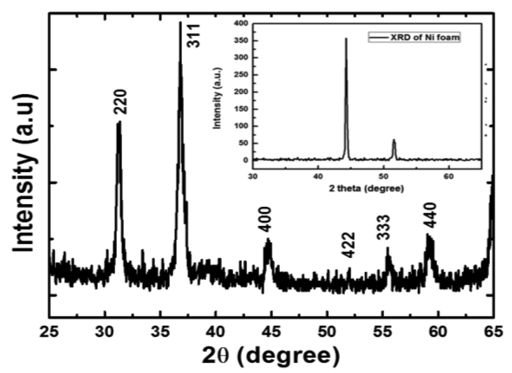 The crystalline study was investigated by XRD before and after the growth of NiCo2O4 nanostructures. The XRD of bare Ni foam substrate is shown in the inset of Figure 2. The XRD pattern revealed two peaks related to Ni. One is well dominated around ∼44° and the other is relatively low at around ∼51.5°. In Figure 2 the visible diffraction peaks for the respective crystal planes include 220, 311, 400, 422, 333 and 440 (as per JCPDS card no. 73-1702). The entire diffraction pattern peaks could be assigned to the face centered cubic crystalline arrays of NiCo2O4 with a space group of Fd3m and are according to the reported work [5]. This study indicates the formation of pure phase of NiCo2O4 nanostructures and no other crystalline phase was observed.