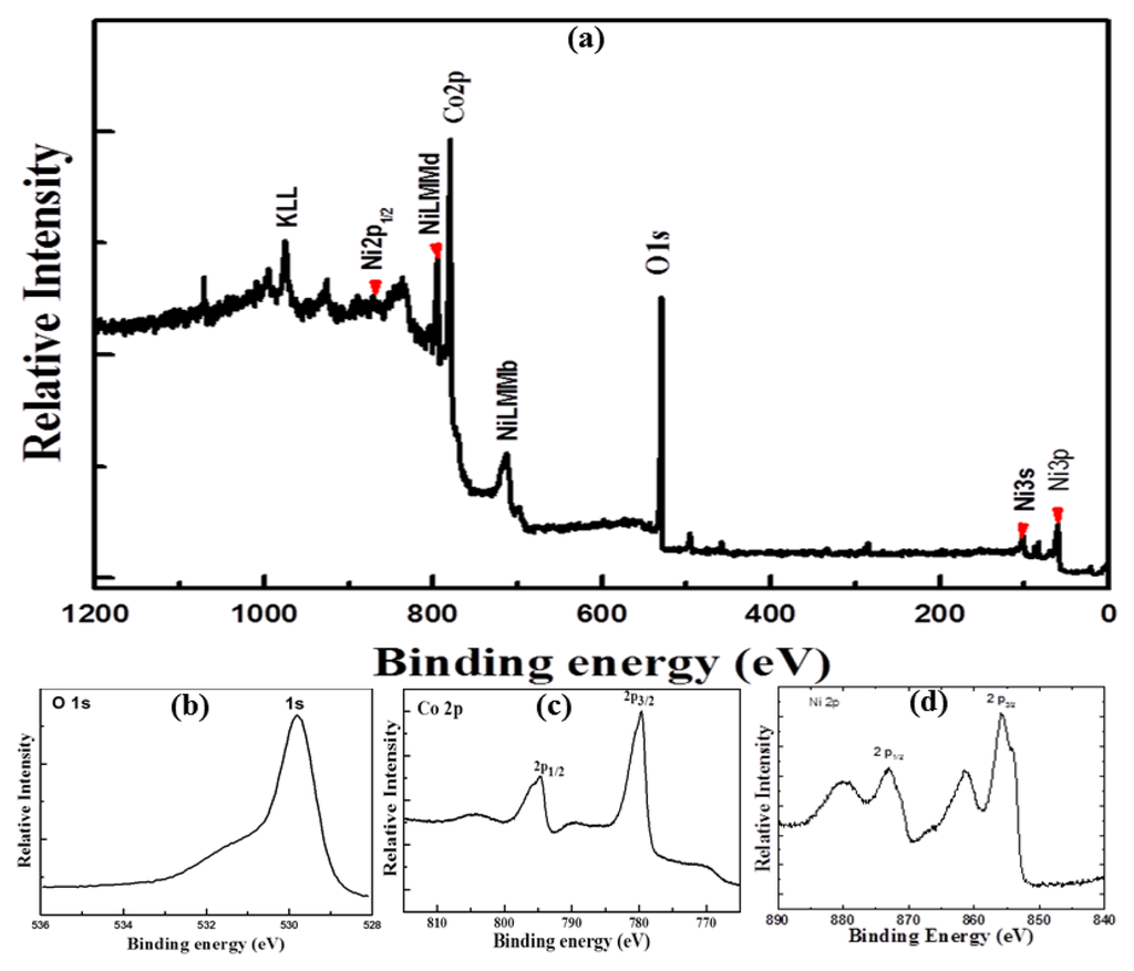 Figure 3b shows the Co 2p photoemission with binding energies of 780.4 eV for Co 2p 3/2 and 796.2 eV for Co 2p1/2, however satellite structure at the binding energies of 786.7 and 802.5 eV for Co 2p 3/2 and Co 2p1/2, respectively, are in good agreement with the reported values [14]. For the O 1s XPS spectrum, the observed binding energy at 529.6 eV is typically assigned to the O-Co/Ni bonding [15] as shown in Figure 3c. The well resolved component energy peak positioned at 531.4 eV is associated to several defect sites with less amount of oxygen coordinated in the sample [16]. Figure 3d shows the Ni 2p 3/2 peak at 855.1 eV and the measured Ni 2p ½ peak at 873.2 eV is attributed to NiO in the sample [17].