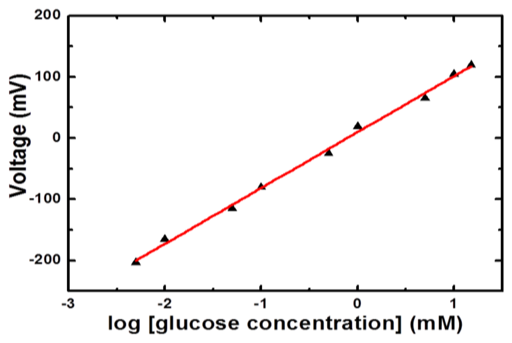 - Shaw, G.W.; Clarement, D.J.; Pickup, J.C.; Bergveld, P. Highly sensitive glucose sensor based on work function changes measured by an EMOSFET. The Analyst. 2003, 128, 1062–1066. [Google Scholar]