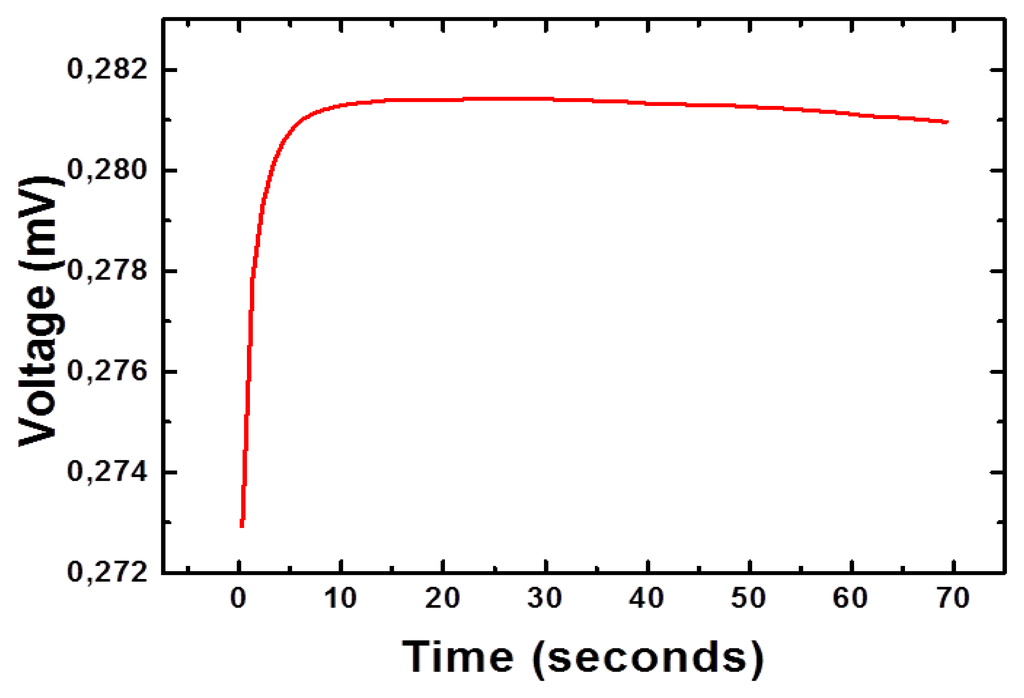 Moreover, the increase in the amount of H3O+ ions in the solution lowered its pH, which can also be used for the monitoring of glucose [18]. The change in the concentration of charged species around the working electrode is responsible for the production of the output potential signal [19]. The nickel foam is porous in nature and it remained useful for the growth of three dimensional (3D) NiCo2O4 nanostructures. The 3D pattern of grown NiCo2O4 nanostructures further adsorbs high degree of glucose oxidase and resulted in highly sensitive potentiometric glucose sensor with sensitivity of 91.34 mV/decade. In addition to this, the sensor electrode has shown a fast response time of less than 10 s, as shown in Figure 5, which could be attributed to the needle-like morphology of NiCo2O4 with high surface area on a porous substrate. The high sensitivity and a fast response time for a reasonable range of glucose concentration gave a clear indication for its potential application in the monitoring of glucose concentrations.
