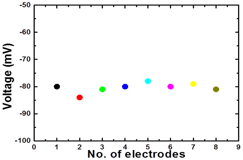 The reproducibility describes the sensor to sensor response for different independent sensor electrodes prepared under similar conditions. Eight independent sensor electrodes were used for the measurement of reproducibility in 0.1 mM concentration of glucose as shown in Figure 6. It can be seen that the sensor to sensor responses deviated less than 3% from each other by relative standard deviation. This demonstrates the highly reproducible response of the proposed sensor based on nickel foam using NiCo2O4 nanostructures. The stability of the sensor was monitored for three weeks by testing the sensor in the detected range of glucose for every week and it was observed that sensor remained stable by showing the same sensitivity and detection range for that period of observation after being kept at 4 °C in refrigerator when not in use. The common interferents for glucose sensors are ascorbic acid, uric acid, dopamine, etc. The sensor electrode was inserted in the physiological concentrations of these interferents present in the human serum and the presented sensor showed negligible response for these interferents due to the fact that glucose oxidase is highly selective for the oxidation of glucose relative to these interferents using potentiometric method. The repeatability of NiCo2O4 nanostructures based glucose sensor electrode was evaluated by conducting a series of three experiments for three consecutive days.