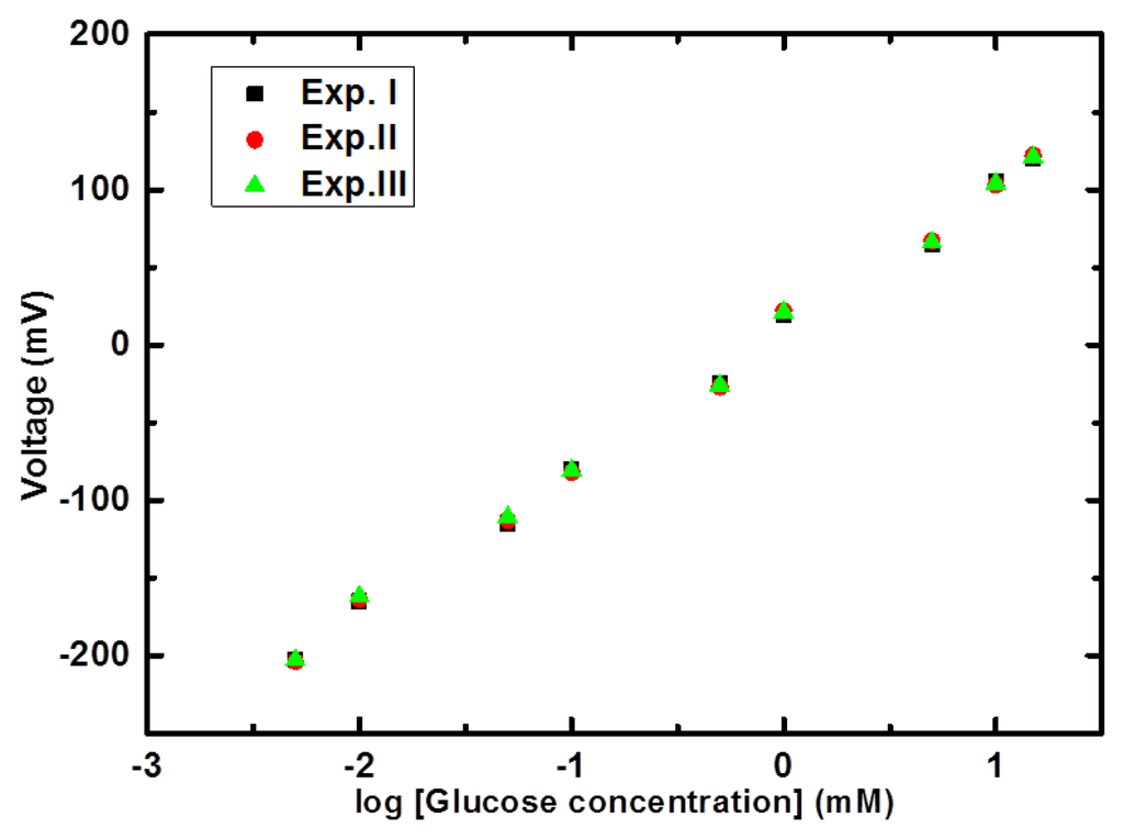 The sensor electrode showed excellent repeatable response as shown in Figure 7. This investigation showed that same electrode can be used for a period of three days without any abrupt change in the sensitivity, stability and detection range of glucose concentrations. Table 1 is showing a comparison between the characteristics of the presented potentiometric biosensor and some other previously reported glucose biosensors.