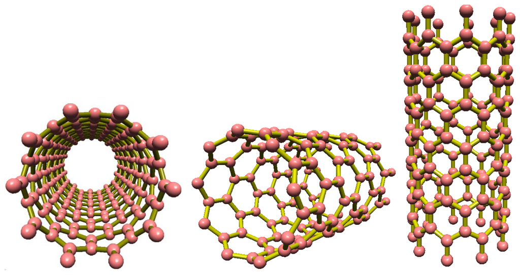 As shown in Figure 1, a single-walled carbon nanotube (SWCNT) is a single layer of carbon atoms formed into a cylindrical network of connected atoms resulting in a tube with a diameter measured in nanometers and a length measured on a micrometer scale [17–19]. The aforementioned properties along with additional features such as small size and high electrical sensitivity make CNTs ideal candidates for use as nanosensors. Experimental and theoretical studies reveal that these nanometer sized CNTs exhibit unique electrical characteristics making them metallic or semiconducting based on their radial dimensions and chiralities [20,21]. More specifically, SWCNTs have the proven ability to sense different small molecules such as NO2, NH3, HCl, Cl2, etc. One suitable configuration for the use of carbon nanotubes in measuring devices is one in which the CNT is placed as an electrical wire between two electrodes. By applying a specific gate bias voltage, CNT conductance is used as the measured variable. Mechanical deformations [22] and/or chemical doping can significantly affect conductance as the CNT electrical properties are heavily dependent upon the atomic structure. Such variations in electrical properties can be easily detected by measuring the electric current. This makes CNTs valuable minute sensors able to detect changes in their environment as they have already been employed in highly sensitive electronic molecule detections [23,24]. In this article, a basic model of how CNTs can be used in gas detection applications has been proposed and the results from the suggested mathematical model are compared with those obtained from the experimental works of other researchers implementing a similar framework. The applicability of the proposed model is validated by the satisfactory agreement of our findings with the experimental data [25].