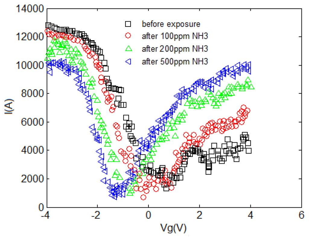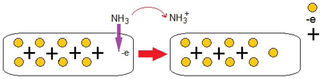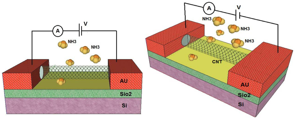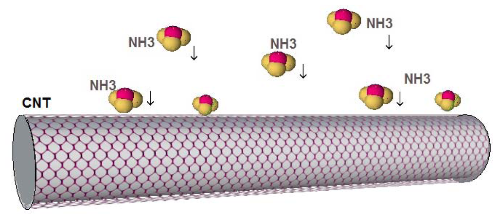 Gases such as CO2, CO, NO, NO2, and O2, can withdraw electrons, while NH3 functions as an electron-donating molecule as shown in Figure 3 [35]. The CO2 and O2 adsorption generates a p-type semiconductor while the adsorption of NH3 results in n-type behavior. Figure 4 illustrates a schematic of CNTs when electron donor NH3 gas molecules are in the atmosphere around the sensor. These strong adsorption effects stem from the inherent properties of gas molecules and the bonding characteristics between these molecules and the CNT. Since it is always important to obtain n-type and/or p-type semiconducting CNT for incorporation in nanoscale electronic devices (e.g., p-n junction and n-type and p-type nanoscale field-effect transistors), the consequent p- or n-type semiconducting behavior can be experimentally detected by applying gate voltage, which can be useful from the application perspective [36].