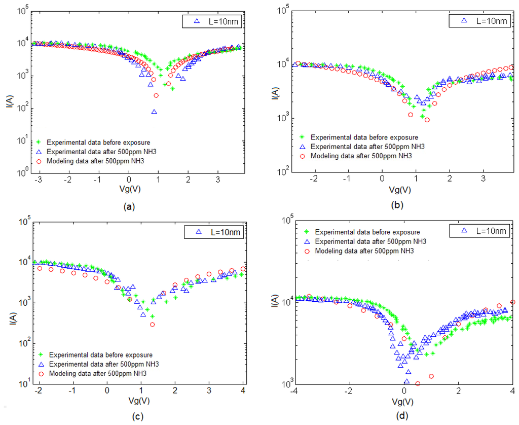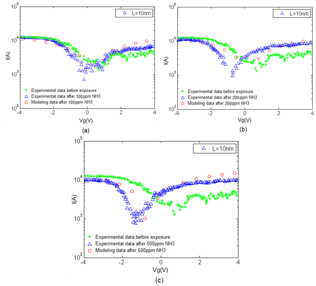 The I–V characteristic of the proposed model compared with experimental results is depicted in Figure 7. An increase in current can be associated with the charge transfer between NH3 and CNT when the NH3 molecules operate as the donor. This phenomenon is also known as chemical doping by gas molecules. The sensitivity can be observed in this figure, indicating the response of CNT-based gas sensor under 100, 200 and 500 ppm NH3 gas. A clear illustration approving the satisfactory agreement between the proposed model and extracted data is provided. In the suggested model, different temperature and concentration values are demonstrated in the form of δ and λ parameters, respectively to reach an agreement with reported data as shown in Table 1.
