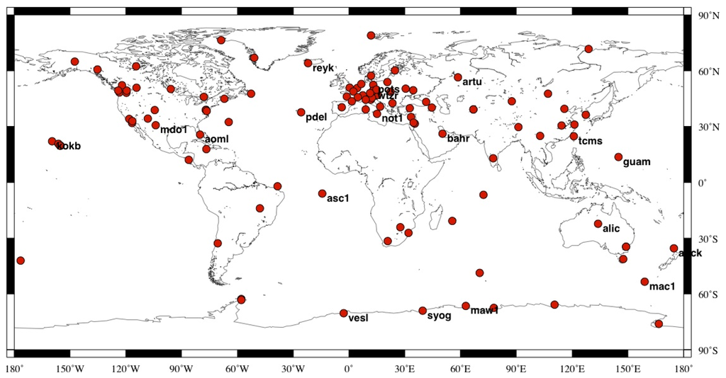 To investigate the impact of MOT on the position of global IGS stations, we implement the above recommended conventional OTL correction method in GAMIT 10.4 by substituting the embedded OTL module with hardisp.f. Then a contrast experiment has been designed by reprocessing the GPS data of 109 evenly distributed global IGS stations using the original (Experiment A) and improved GAMIT (Experiment B) [21]. The difference between experiment A and B only comes from the OTL modeling. In experiment A, the OTL correction considered the effects of 11 main ocean tides, while in experiment B, we account for the MOT induced surface displacement by expanding the 11 main tides into 342 ocean tidal constituents. In this way, the contribution of MOT to daily GPS solution and continuous GPS time series of the global IGS stations could be determined by differencing between experiments A and B. Spatial distribution of the selected IGS stations is shown in Figure 1. To reduce time, only data on Wednesdays during the period of June, 1998 to December, 2010 are processed. The global grid of the amplitudes and phases for the 11 main tides with spatial resolution 0.125° × 0.125° is obtained from the FES2004 model [35].