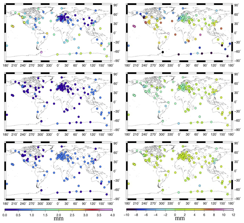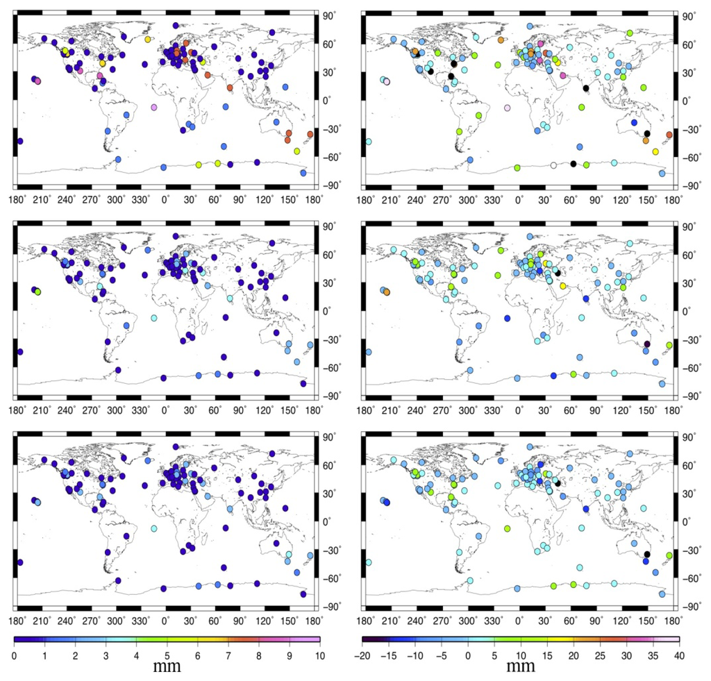 To have a better understanding of the global MOT effect, Figure 3 describes the standard deviation (STD, left panels) and the maximum displacement (right panels) of the MOT loading time series for the 109 stations. From top to bottom are the up (U), east (E), and north (N) components. We can see that MOT could only cause small variations in stations' horizontal displacement, with most of the STD and absolute maximum displacement smaller than 1 mm and 3 mm respectively. For the U component, however, it's quite a different story. In general, the vertical displacement induced by MOT becomes smaller with the increasing distance between station and the sea. This is obvious due to the characteristics of the ocean tidal loading itself. Coastal and island stations suffer the most MOT effects, with the biggest STD and the absolute maximum height reaching more than 3.5 mm and 10 mm respectively. For inland stations, the MOT effects are much smaller, with most of the height variation smaller than 1.5 mm, in particular for those in the Eurasia plate, which have almost the same magnitude as that of the E component.