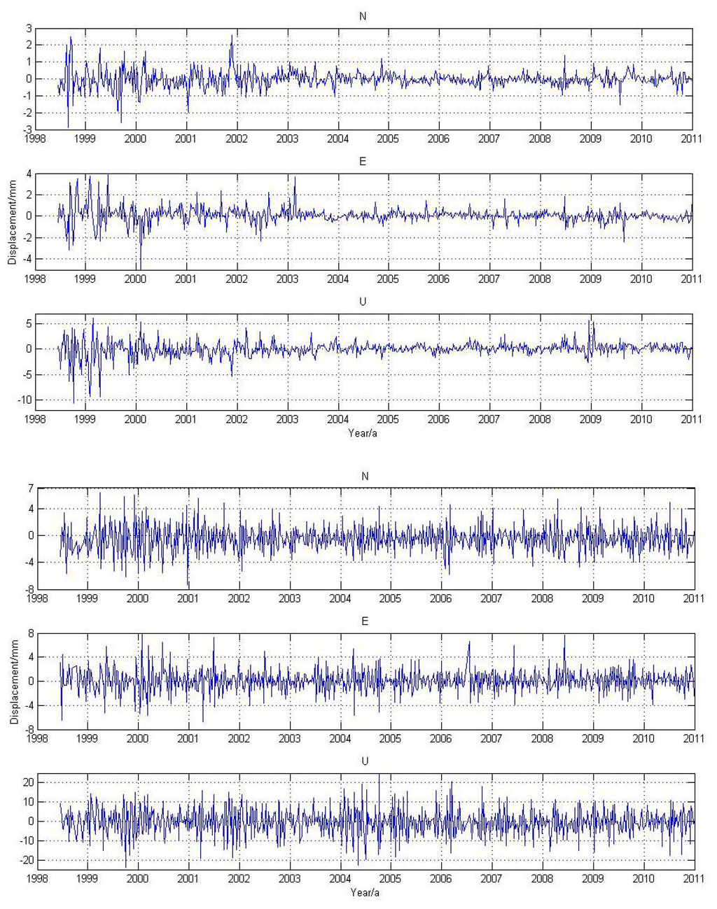 In Section 3.1, we give the magnitude of stations' displacement caused by MOT. Through reprocessing the GPS data by using the method outlined in Section 2.2, we obtain the MOT effect on the 24-hour daily GPS solutions. Figure 4 shows an example of the weekly GPS time series for station ALIC (Northern Territory, Australia) and REYK (Reykjavik, Iceland) due to MOT effects.