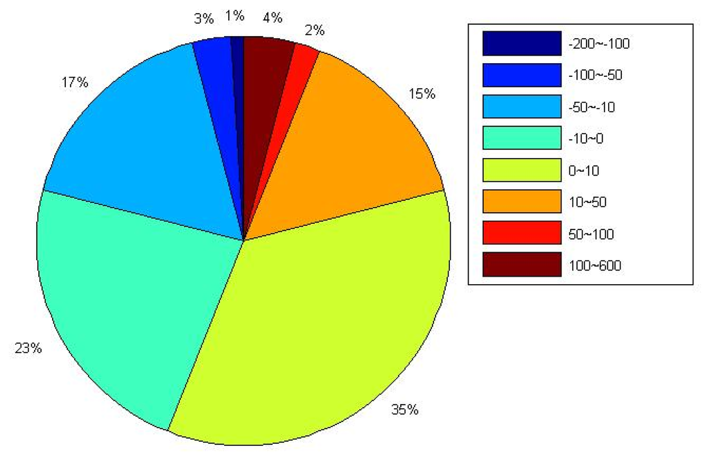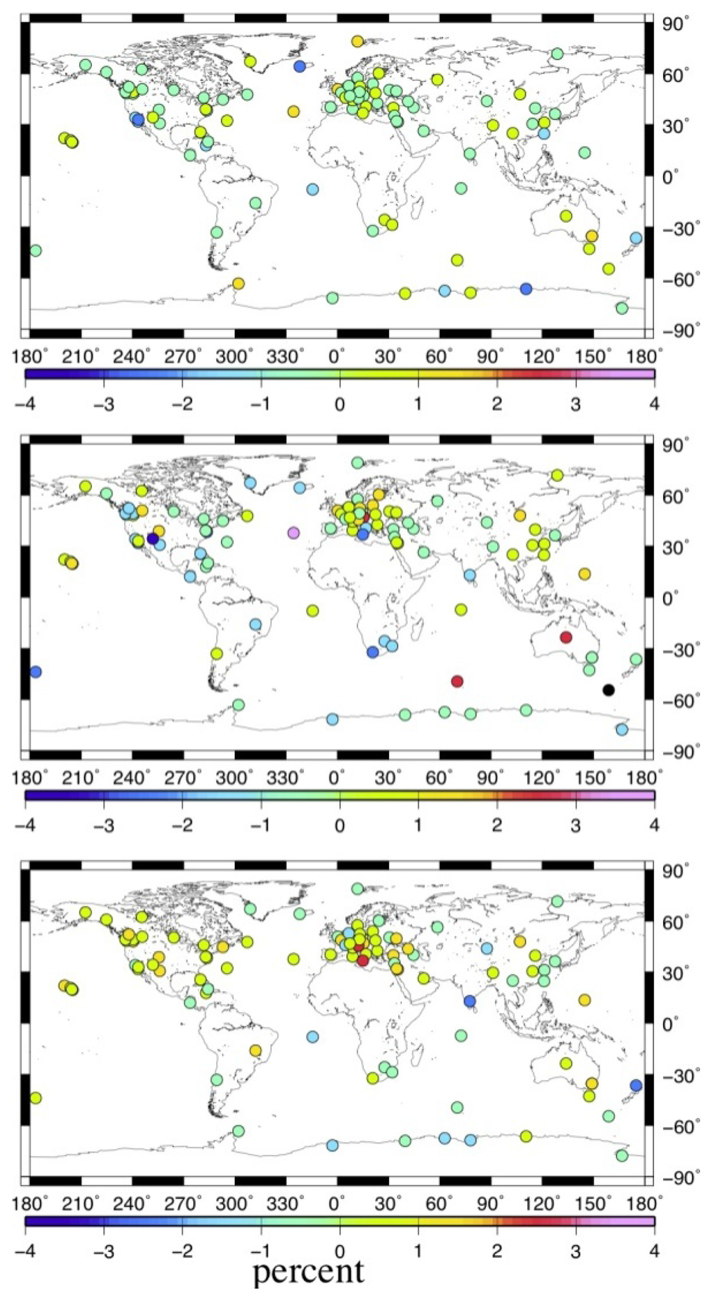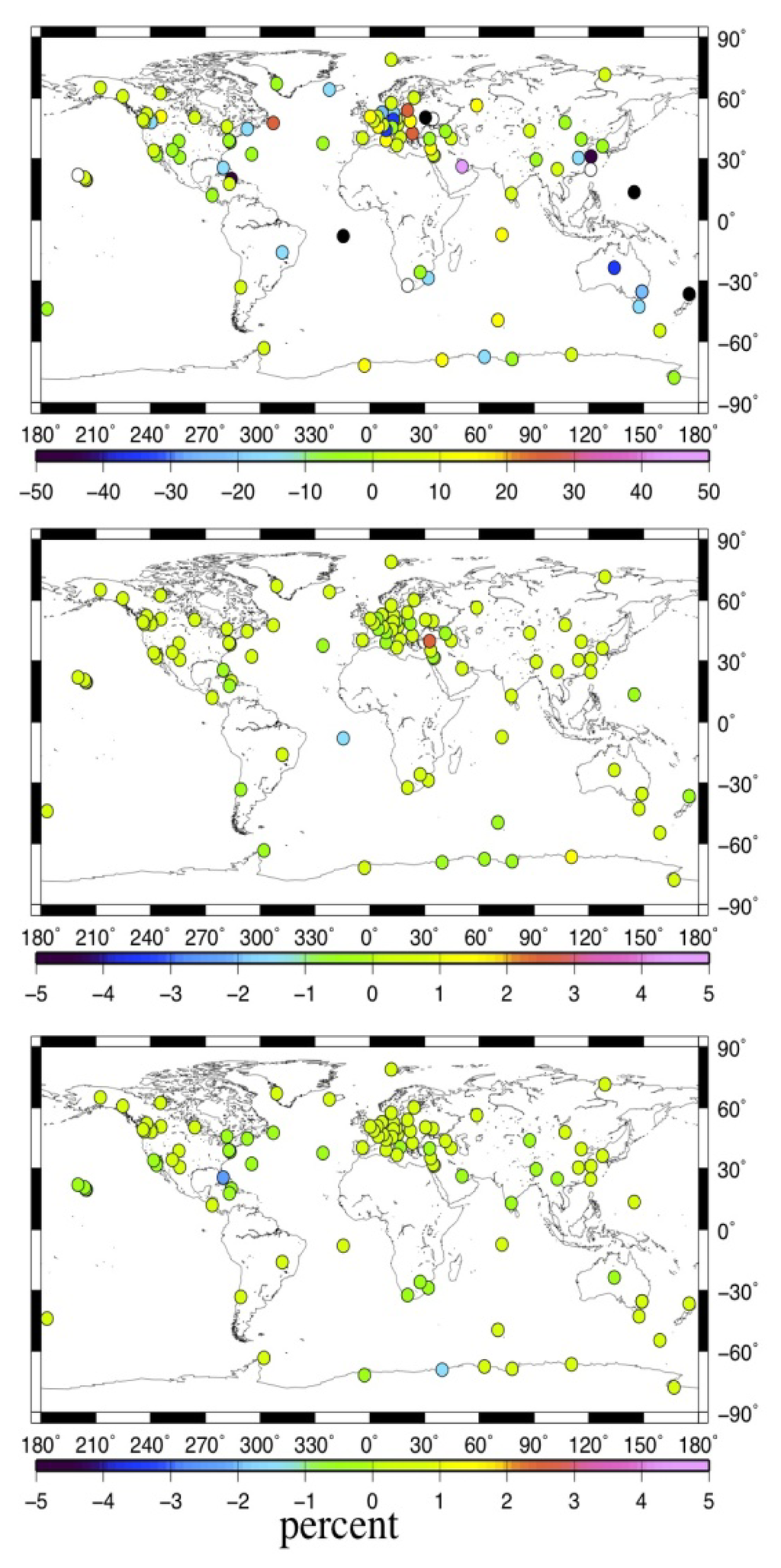 To investigate the impact of MOT on the non-linear characteristics of global IGS stations, we calculate the weighted root mean square (WRMS) of the coordinate time series for the 109 stations before and after considering the MOT effect. Here, we also only estimate the WRMS of IGS stations with continuous observation span of more than three years. Figure 8 illustrates the spatial distribution of the MOT induced WRMS variation rate. Negative means that the WRMS reduced after implementing MOT correction. Figure 9 gives the percentage of stations with the WRMS variation rate inside different ranges. For the definition of the WRMS and its variation rate, please refer to [22] for detail.