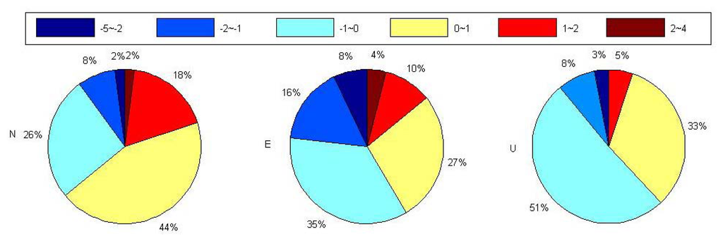 During the data reprocessing, satellite orbits, earth orientation parameters (EOPs), site coordinates together with the tropospheric delay and the horizontal gradient parameters are resolved simultaneously. Loose constraints are implemented on the stations, among which the constraints of IGS core stations are set as 5 cm, and non-core stations are 1 dm. Where possible, ambiguities are fixed to integers [36]. Satellite cut-off elevation angle is chosen as 10 degree, and site-specific, elevation-dependent weighting of the observations based on an assessment of the post phase residuals has been applied [27]. Corrections of solid Earth tide, ocean tide, pole tide as well as atmospheric tide have been implemented [6,37]. Vienna Mapping Function 1 (VMF1) troposphere mapping functions are used to calculate tropospheric delay [38,39]. Where possible, receiver-independent exchange (RINEX) meteorological files (.m) are used to provide pressure and temperature for the a priori zenith hydrostatic delay; otherwise, values from VMF1 are used [40]. Absolute antenna phase center offsets and variations are used (igs08_1636.atx) [41]. Impacts of second and third-order ionospheric delay are considered, during which the International Geomagnetic Reference Field 11 (IGRF 11) is selected to calculate the second-order ionospheric delay [36]. Non-tidal loading corrections are not implemented according to the IERS Conventions 2010 [4]. Finally, gross error rejection and datum transformation are implemented to the daily baseline resolutions using GLOBK to obtain stations' coordinate time series and velocities under the ITRF08 [42]. During the datum transformation, only six parameters, that is three rotation and three translation parameters are estimated to reduce the aliasing effects of the unmodeled surface mass loadings, e.g., the non-tidal atmospheric loading [43].